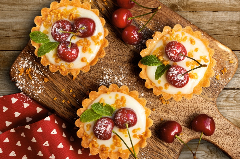7. Portion out the pudding you removed from the fridge among your tartlets. After placing the cherries on the top, sprinkle the powder whipped cream remaining in the package. Garnish with fresh mint as you like.