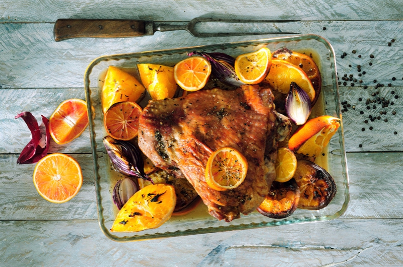 2. Flour the oven bag and shake the excess flour. Place the turkey drumstick, onions and celery stalks in the bag. Season with salt and black pepper. Slice one orange with the bay leaves and add them. Punch holes with a pin on the bag and close it tightly. Bake for 15-20 minutes in an oven set to 200 degrees. Then, lower the temperature to 180 degrees and bake for another 25-30 minutes.